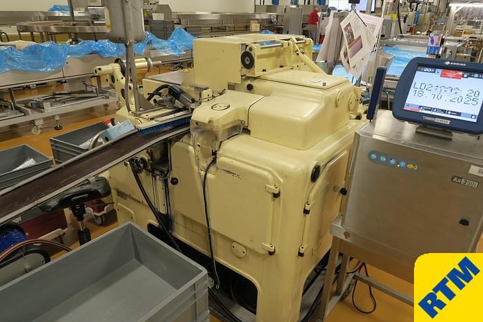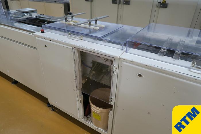 Para barras de 50 g, hasta una envolvedora de barras SIG CK, reconstruida en 2022 por LAREKA, lámina de bobina, etiqueta de pila, con unidad de pegamento conceptual ROBATECH del año 2022