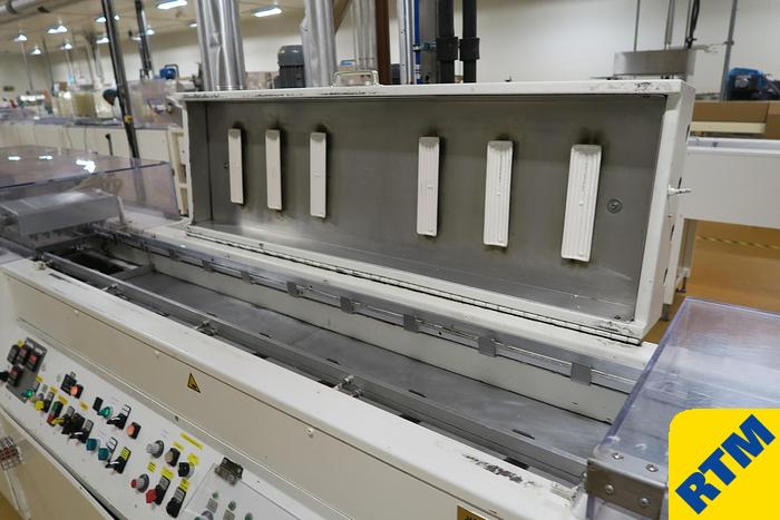 Para barras de 75 g, hasta una envolvedora de barras SIG CK, reconstruida en 1992 por PACKAGING OVERHAUL, lámina de carrete, etiqueta de pila, con unidad de pegamento