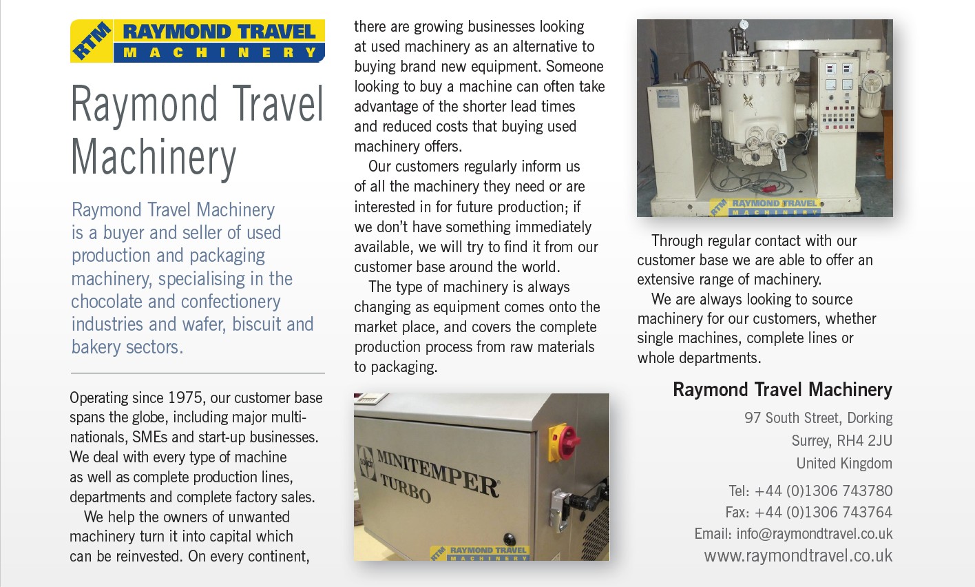Raymond Travel Machinery Ltd est un acheteur et un vendeur de machines de production et d'emballage d'occasion. Basée au Royaume-Uni, l'entreprise a été fondée par M. Raymond Hart et est aujourd'hui dirigée par ses fils Paul et Jason. En activité depuis 1975, notre clientèle s'étend sur toute la planète, y compris de grandes multinationales, des PME ainsi que des start-ups. Nous achetons et vendons tous types de machines de production et d'emballage d'occasion, des plus petites et plus simples machines pour une start-up, jusqu'aux unités beaucoup plus grandes pour augmenter la production ou le rendement d'emballage de nos clients.